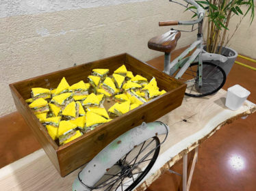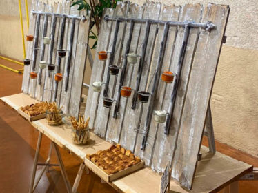 Ôthentique revisits the concept of the market stall; the buffets are placed on boards and trestles. The trays are designed in elongated shapes. Some presentations have a vintage feel: a bike has been recycled as a delivery bike, candle holders have been adapted to hold brandade (fish bake) and tapenades; Natural materials and recycled objects convey the authenticity of the products on offer.